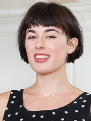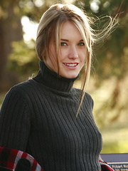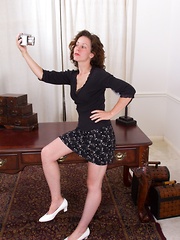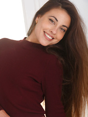 Elegant Sally A flips around her beautiful crimson hair then sliding out of her little knit dress to present her perfect breasts and hairy pussy.
